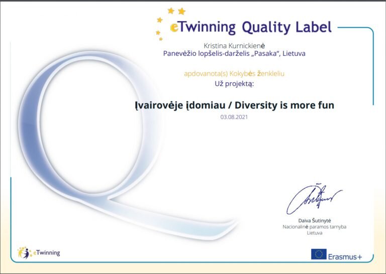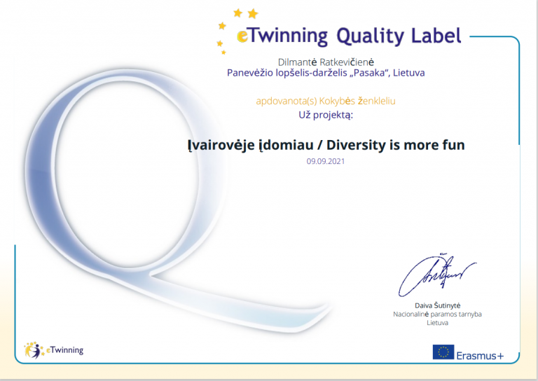 Projektinė veikla paįvairina ugdytinių veiklas, taip praturtindama ugdymo procesą. Ir vėl norime pasidžiaugti mūsų darželio eTwinning projektu „Įvairovėje įdomiau”. Sėkmingai įgyvendinę projektą, buvome įvertinti eTwinning nacionaliniais kokybės ženkleliais. Taip pat turėjome galimybę sudalyvauti Respublikinėje eTwinning projektų mugėje, kurią organizavo Šiaulių lopšelis-darželis „Pasaka“. Organizatoriai parengė gražų leidinį, kuriame publikuojami mugėje dalyvavę projektai apdovanoti nacionaliniais kokybės ženkleliais. Su leidiniu susipažinti galima paspaudus čia: „Respublikinė eTwinning projektų mugė 2021″.