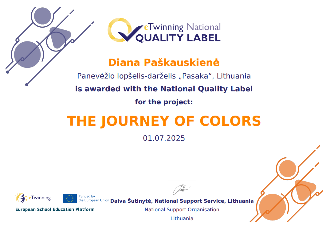 Lopšelio-darželio „Pasaka" ugdytiniai kartu su mokytoja Diana Paškauskiene dalyvavo tarptautiniame eTwinning projekte „Spalvų kelionė" („The Journey of Colors"), kuris 2025 m. buvo įvertintas eTwinning Nacionaliniu kokybės ženkleliu. Tai reikšmingas įvertinimas, patvirtinantis aukštą projekto kokybę, kūrybiškumą, bendradarbiavimą ir mokymo(si) vertę.